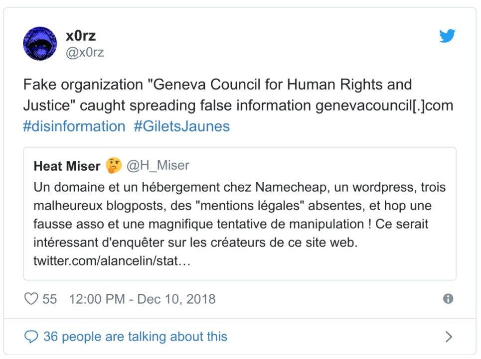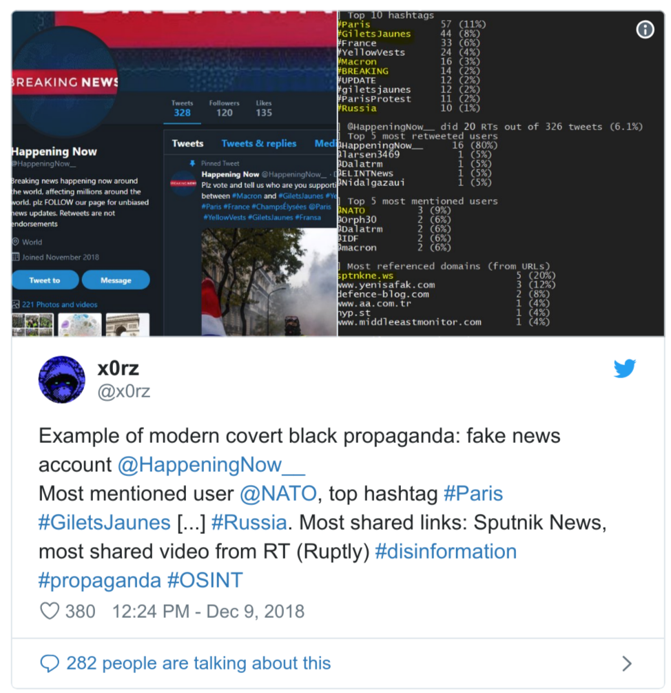 J'ai déjà parlé d'opérations psychologiques contre la France via des réseaux sociaux tels que Twitter. Cette fois, les propagandistes étrangers tirent parti des événements actuels (les protestations des gilets jaunes) pour faire avancer leur programme politique à un nouveau niveau. Voici une partie de mon enquête en cours que je voulais partager.